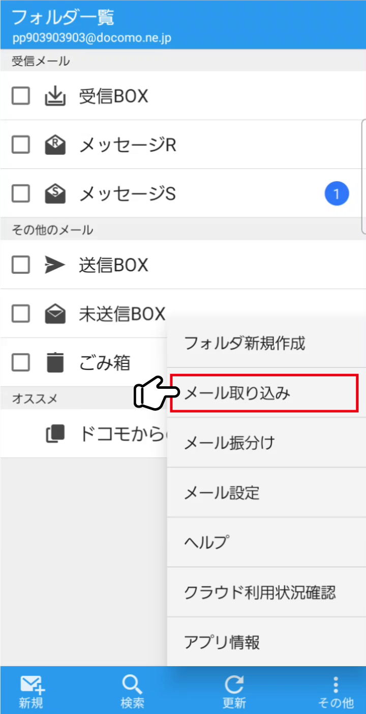 端末内にメールデータを保存した後、フォルダ一覧画面にて、右下の「その他」アイコンをタップし、「メール取り込み」をタップします。