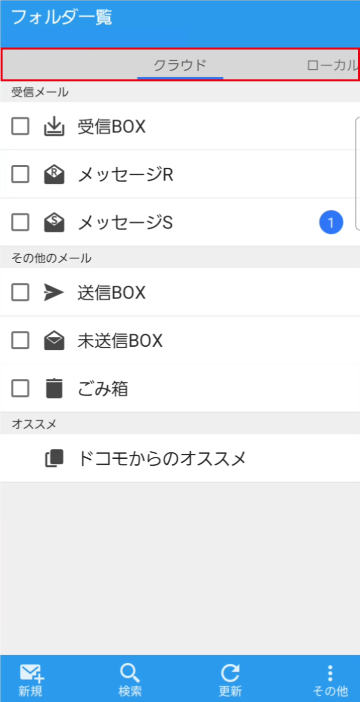 ドコモメールを起動後、ローカルに保存するメールの左側のチェックボックスをタップするか、長押ししてチェックをつけ、選択状態にします。