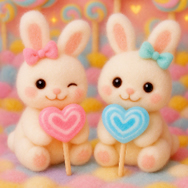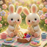【春の森でひと休み、ふわうさぎのピクニック】やわらかな春の森の草原にパステルカラーの花が咲き、チェック柄のブランケットに座ったふわふわの白うさぎたちが、小さなサンドイッチとかごいっぱいのフルーツでピクニックを楽しむライブ壁紙