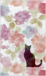 やわらかな雨に包まれた紫陽花と黒猫たち。